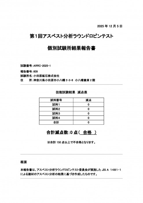 第1回アスベスト分析ラウンドロビンテストに合格しました