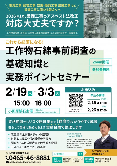小田原鉱石では制度改正に伴い、「工作物石綿事前調査」を実務目線で解説する無料オンラインセミナーを開催いたします。ぜひご参加ください。