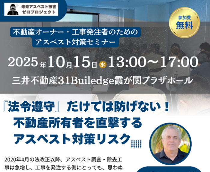 「未来アスベスト被害ゼロプロジェクト」が主催する「不動産オーナー・工事発注者のためのアスベスト対策セミナー」に出席します。