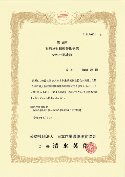 弊社は、公益社団法人 日本作業環境測定協会が実施する「石綿分析技術評価事業」に毎年参加し、本年度も継続して合格評価を取得いたしました。