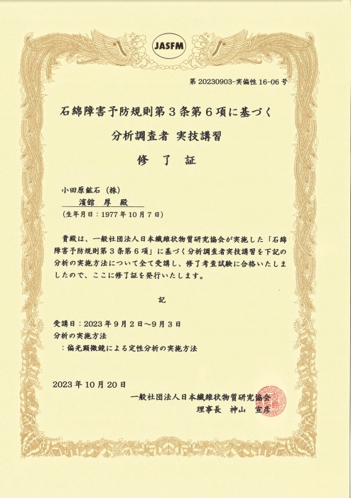 石綿障害予防規則第3条第6項に基づく分析調査者実技講習「偏光顕微鏡による定性分析の実施方法」に合格しました。石綿則に基づく事前調査のアスベスト分析マニュアル(厚生労働省)の第3章.定性分析方法1(偏光顕微鏡法)、JIS A 1481-1 第1部:市販バルク材からの試料採取及び定性的判定方法の内容に該当します。