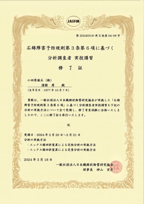 石綿障害予防規則第3条第6項に基づく分析調査者実技講習「偏光顕微鏡による定性分析の実施方法」に合格しました。